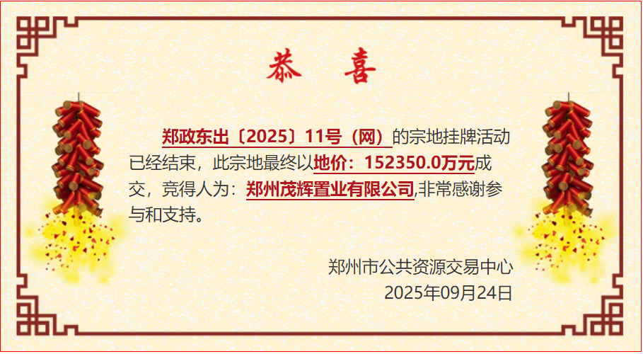 【大河财立方消息】金茂再度落子郑州北龙湖。9月24日,郑州茂辉置业有限公司以15.235亿元的成交价,竞得郑政东出〔2025〕11号(网)地块。